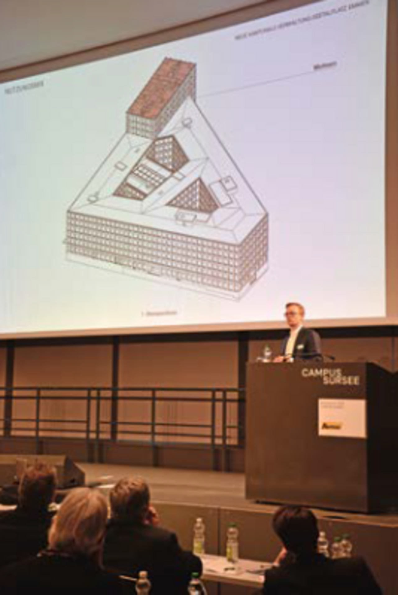 Den fünften und letzten Fachvortrag hielt Architekt Daniel Pescia von der Max Dudler AG. Er leitet die Max Dudler AG Schweiz in Zürich. Seine Schauplätze: Hochhaus in Zürich-Oerlikon, die Europaallee in Zürich, den Max Towers in Aesch (BL), das Hydrel-Areal in Romanshorn. Schnell wurde deutlich, dass sich die Max Dudler Architekten vor allem Grossprojekten verschrieben haben. Besonders eindrücklich waren die Bilder und Erklärungen zum Objekt Max Towers: 120 Eigentumswohnungen werden hier bis Weihnachten 2024 fertiggestellt. Und zwar ganz nach dem Motto von Architekt Pescia: «Städte verdichten, Landschaften schützen».