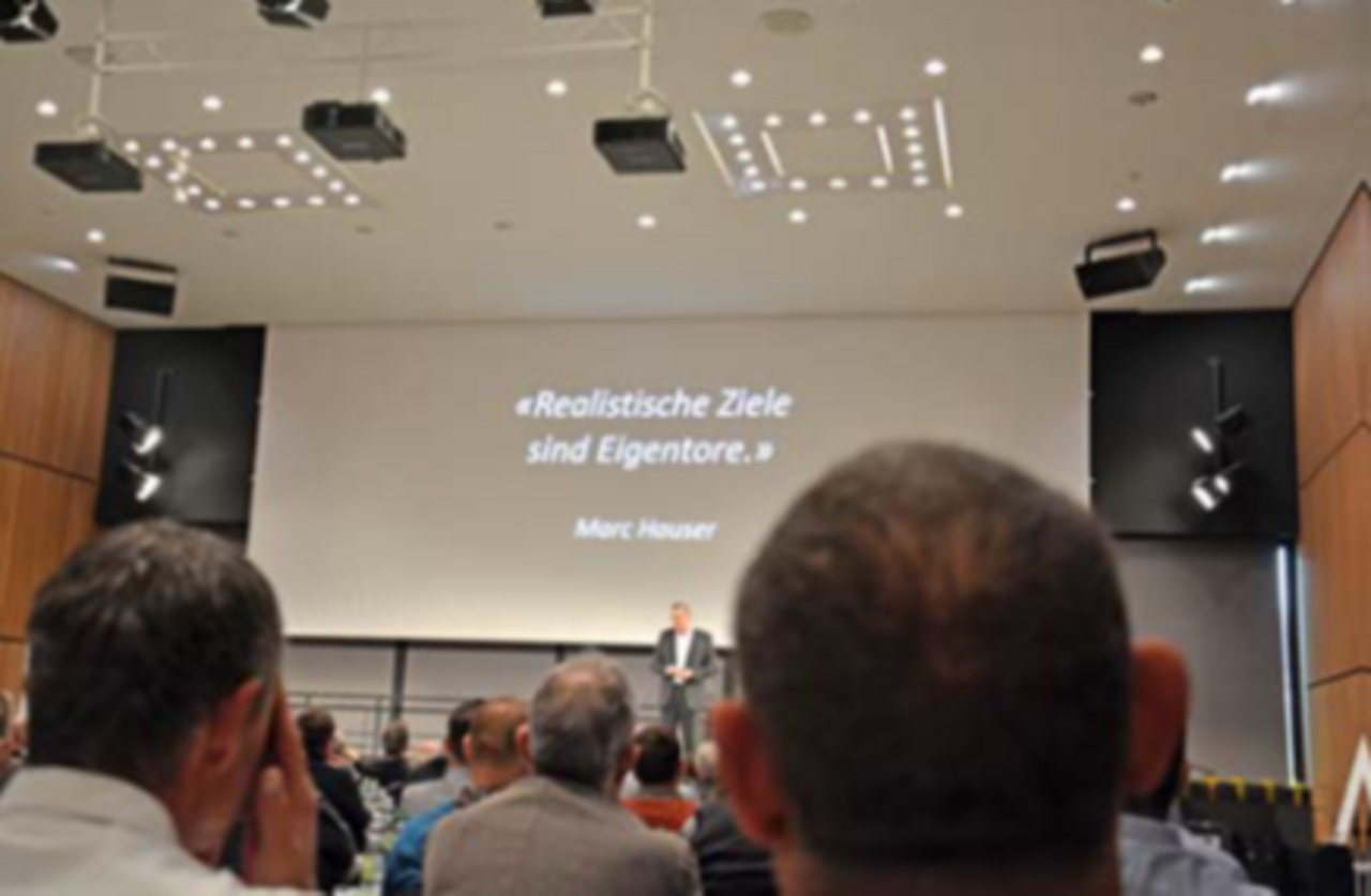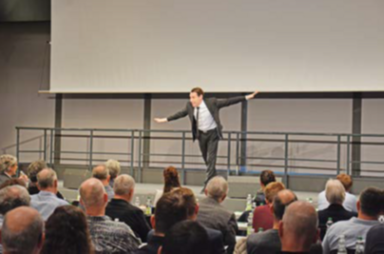 Nach dem Kaffee mit Gipfeli und Obst, begrüsste der Magier und Ökonome Christian Bischof die 140 Anwesenden und zeigte, wie leicht es ist, Fünflieber um Fünflieber aus der Luft zu picken. Er versicherte, dass er dieses Geld der Schweizer Strasseninfrastruktur spenden werde. Um es gleich vorwegzunehmen: Bischof moderierte souverän durch den Vormittag und zeigte mehrmals, weshalb er Schweizermeister der Zauberkunst ist.