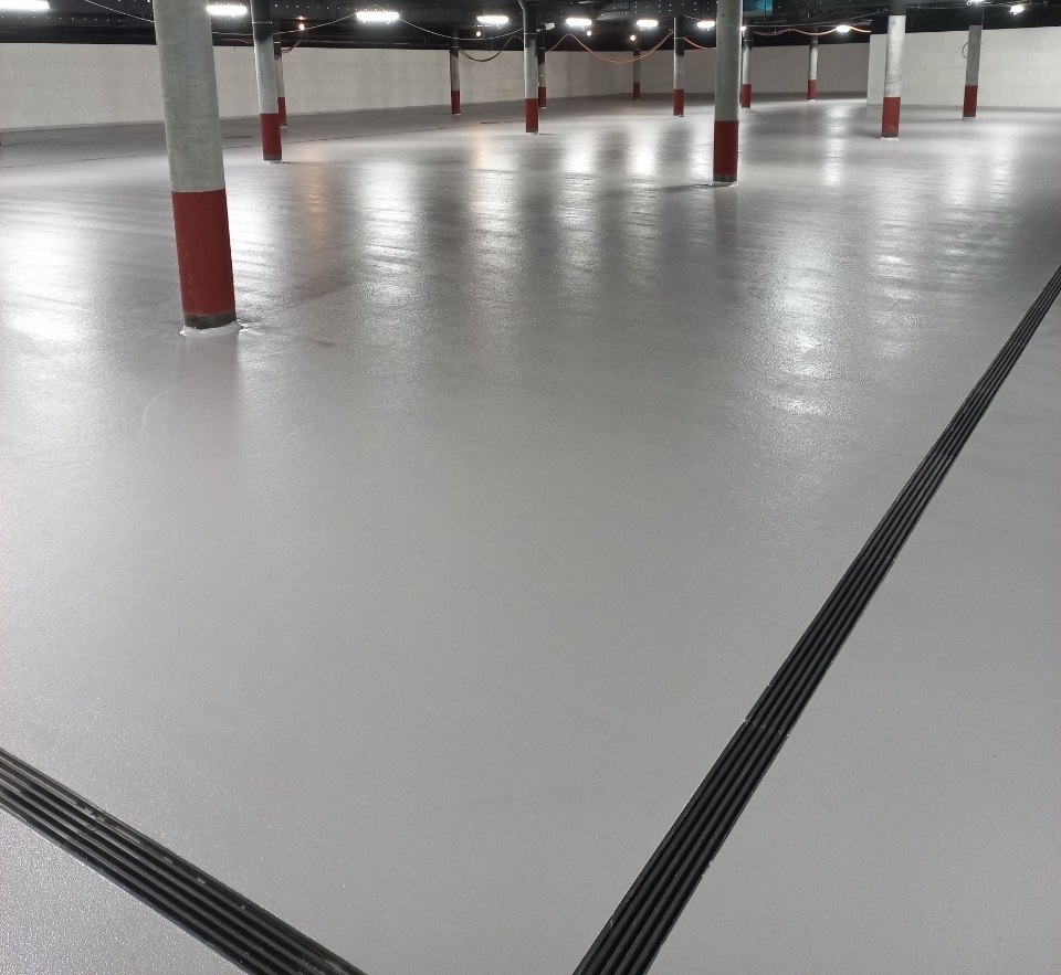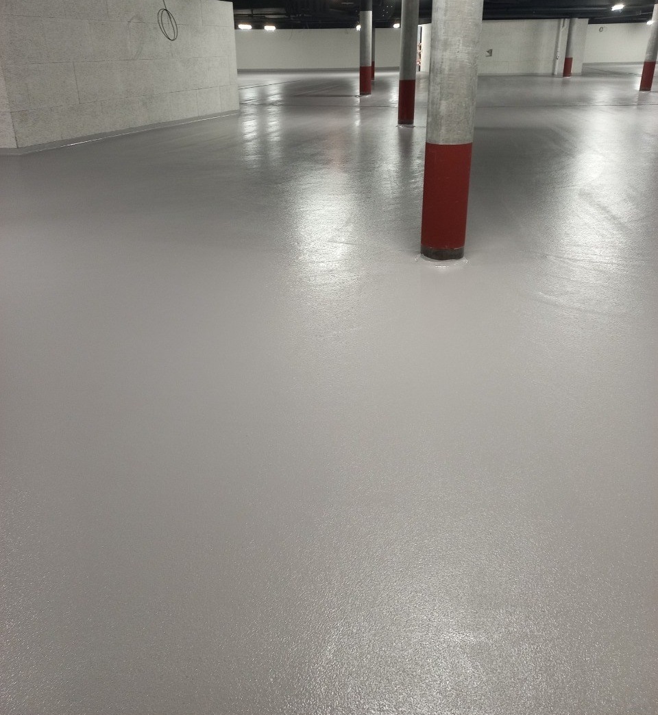 | Ausgeführte Arbeiten 2'600m2 Untergrundvorbereitung mittels kugelstrahlen, Innenparkingbeschichtung mit EP-Einstreubelag, Hohlkehle |