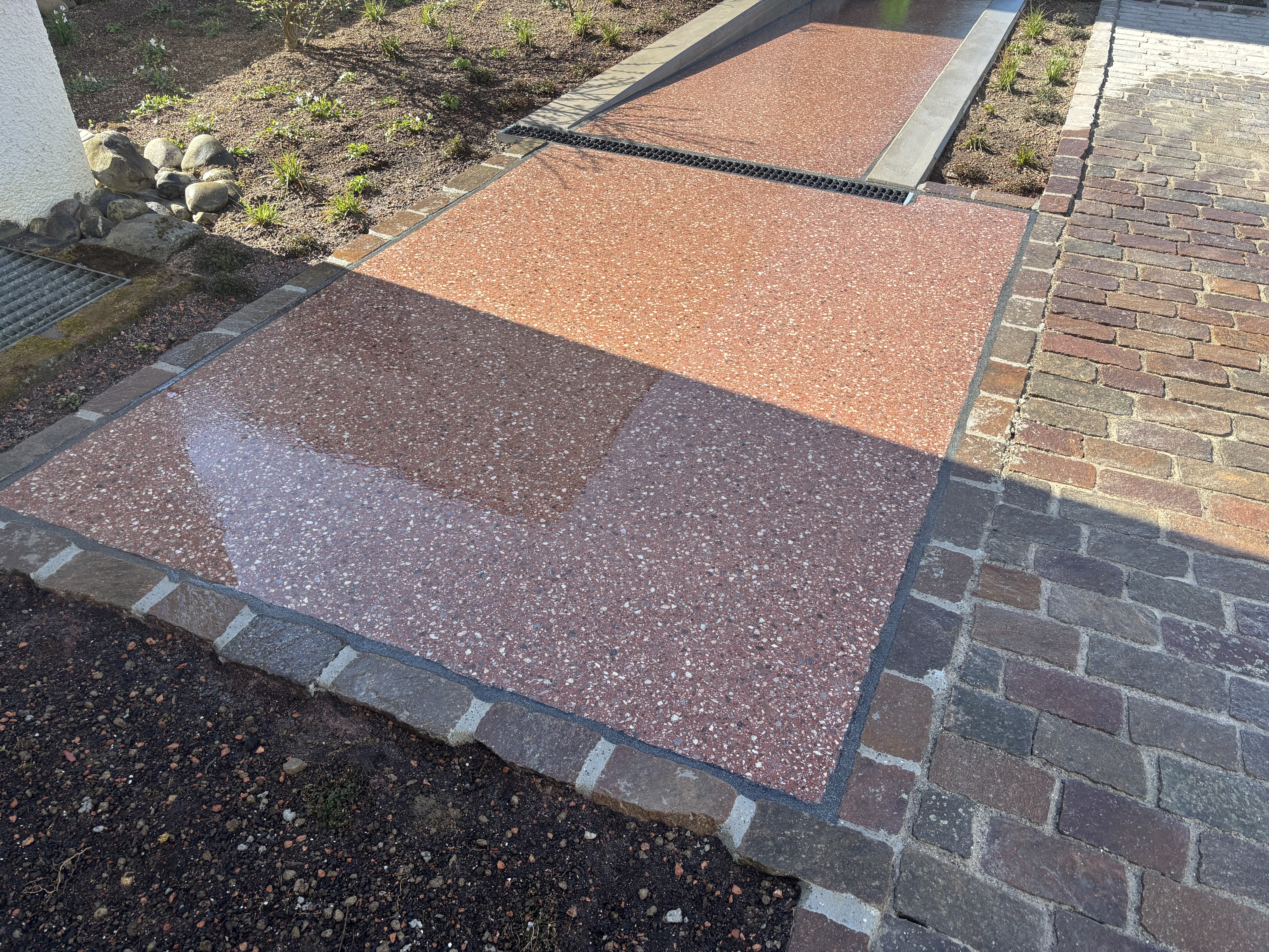 | Ausgeführte Arbeiten 85m2 Platzgestaltung mit farbigem Gussasphalt (Deckschicht), geschliffen und gestockt, Heissvergussfugen |