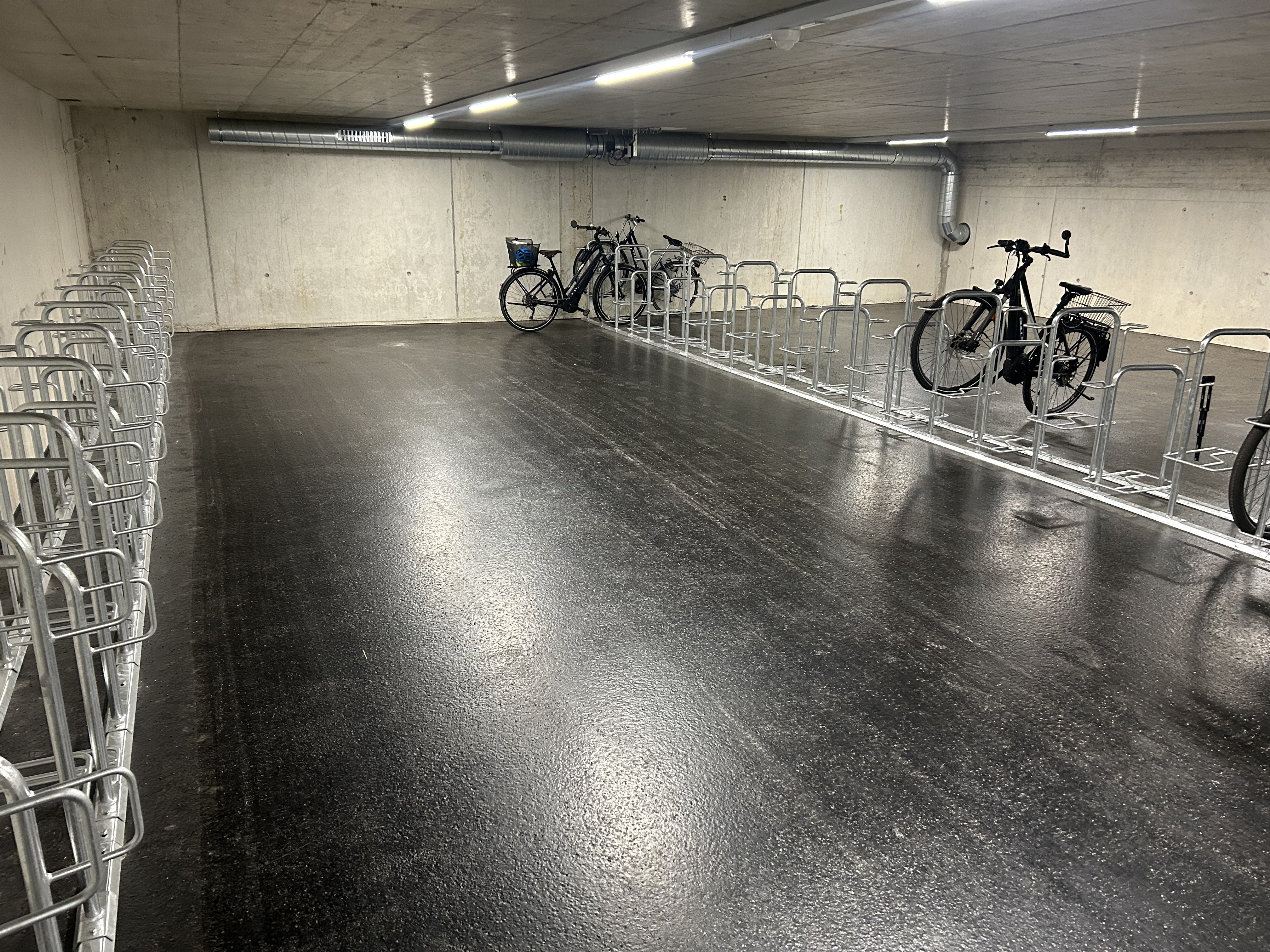 | Ausgeführte Arbeiten Einbau der Schutz- und Deckschicht von Hand Oberfläche Veloparking: leicht abgesplittet mit bit. Splitt 2/4 Oberfläche Innenhöfe, Eingänge: geschliffen Heissvergussfugen |