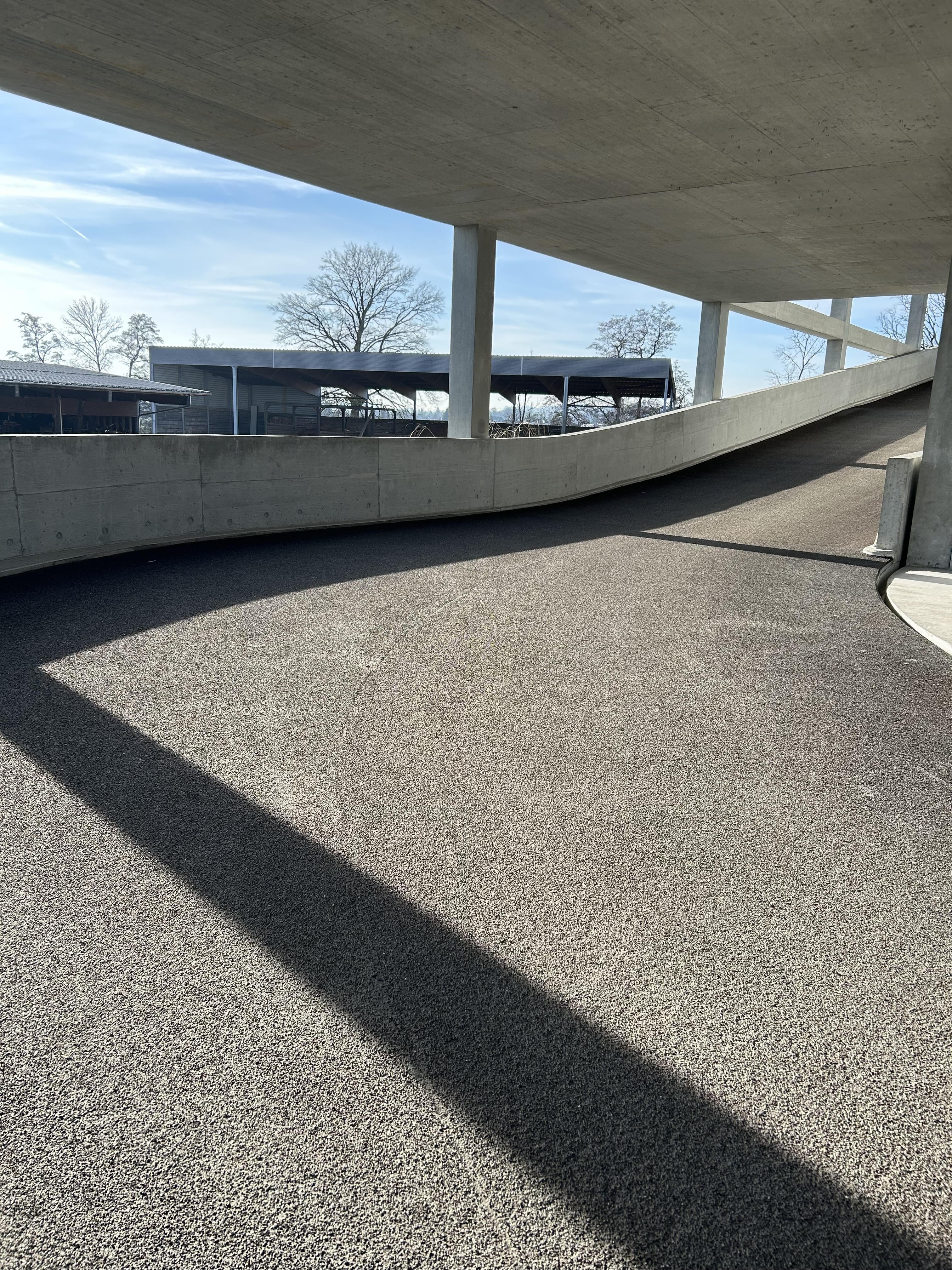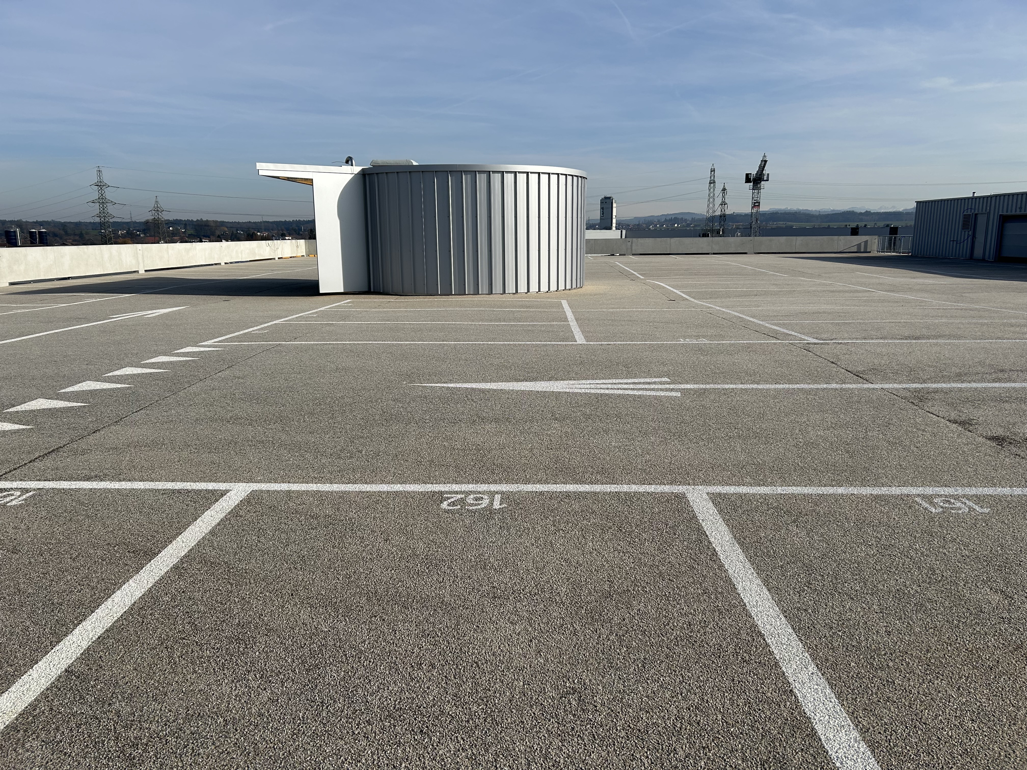 | Ausgeführte Arbeiten 2'735m2 Untergrundvorbereitung mittels kugelstrahlen, PBD-Abdichtung, Rampe PBD-Randverklebung, Einbau Schutz-/Deckschicht von Hand je 35mm Dachgeschoss, Rampe 2 x 30mm, helle Absplittung auf Dachgeschoss, bit. Splitt 2/4 auf Rampe, Heissvergussfugen |