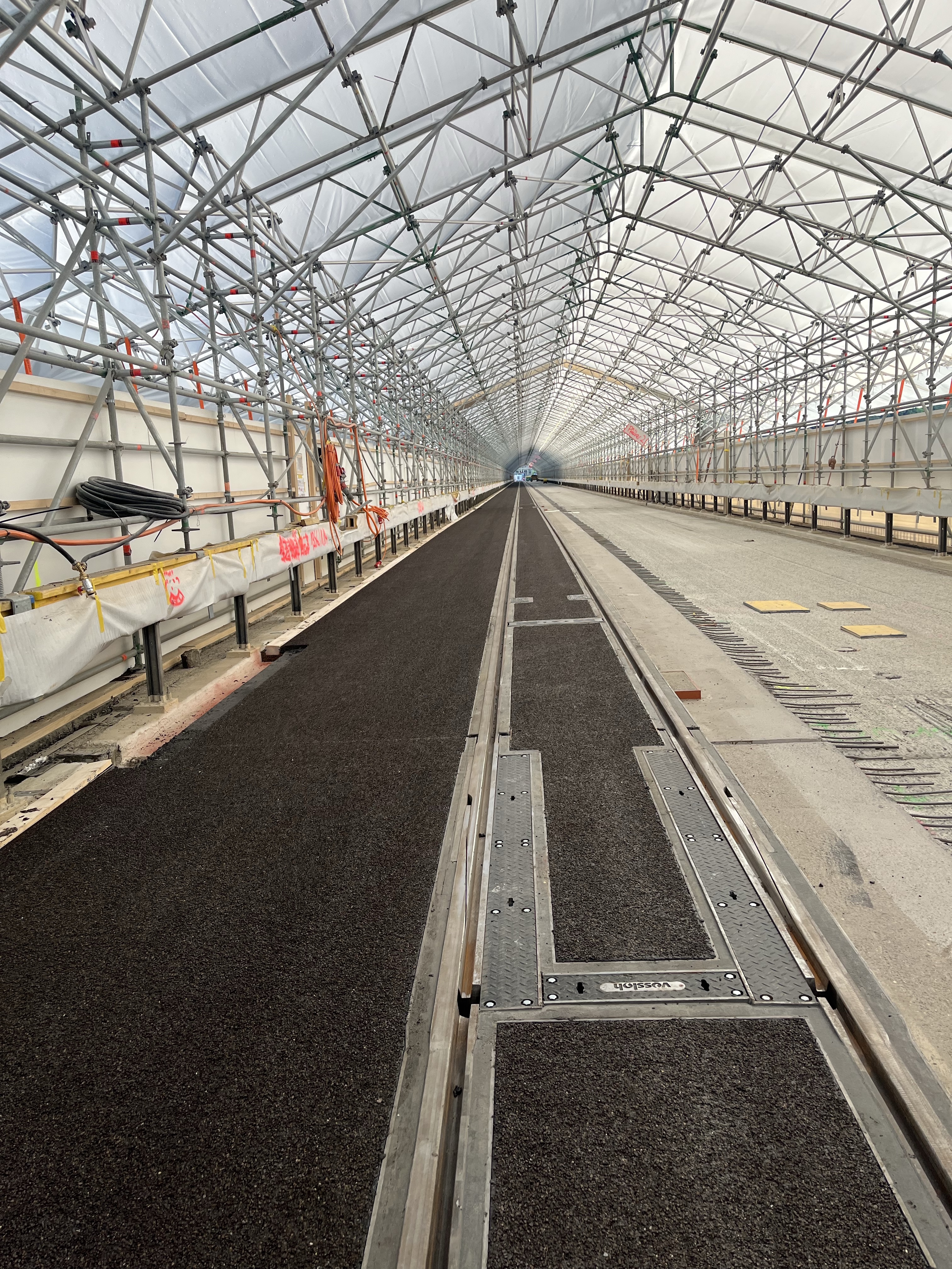 | Ausgeführte Arbeiten 4’300m2 Kugel-/Sandstrahlen, PMMA-Abdichtung auftragen, Einbau der Schutz- und Deckschicht maschinell und von Hand, Absplittung mit bit. Splitt 3/6 |