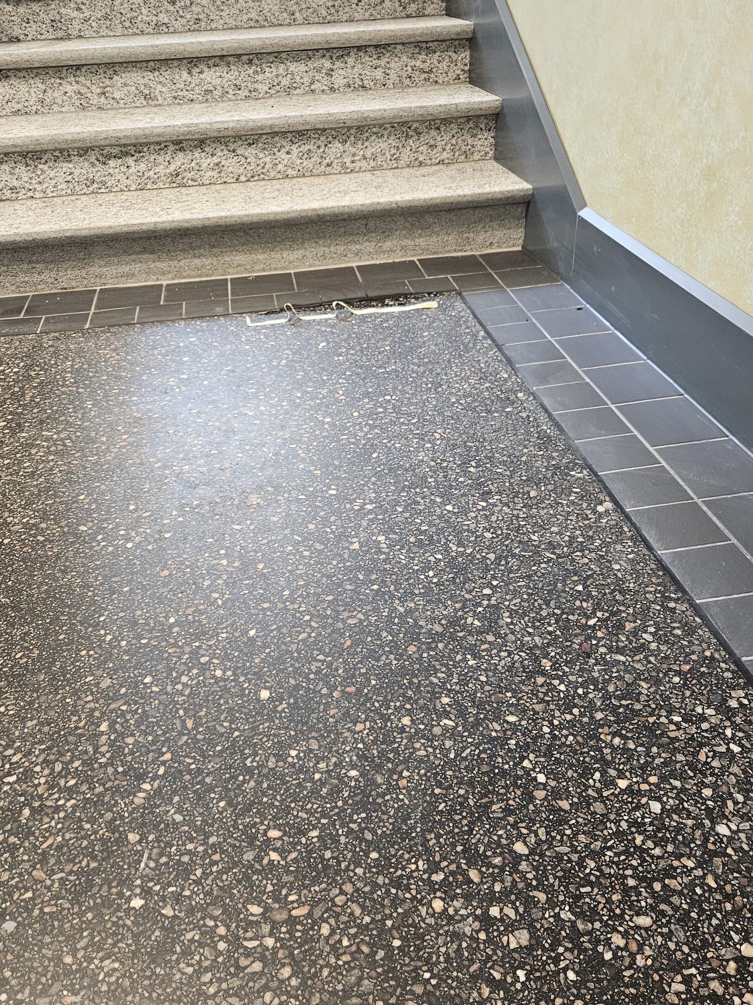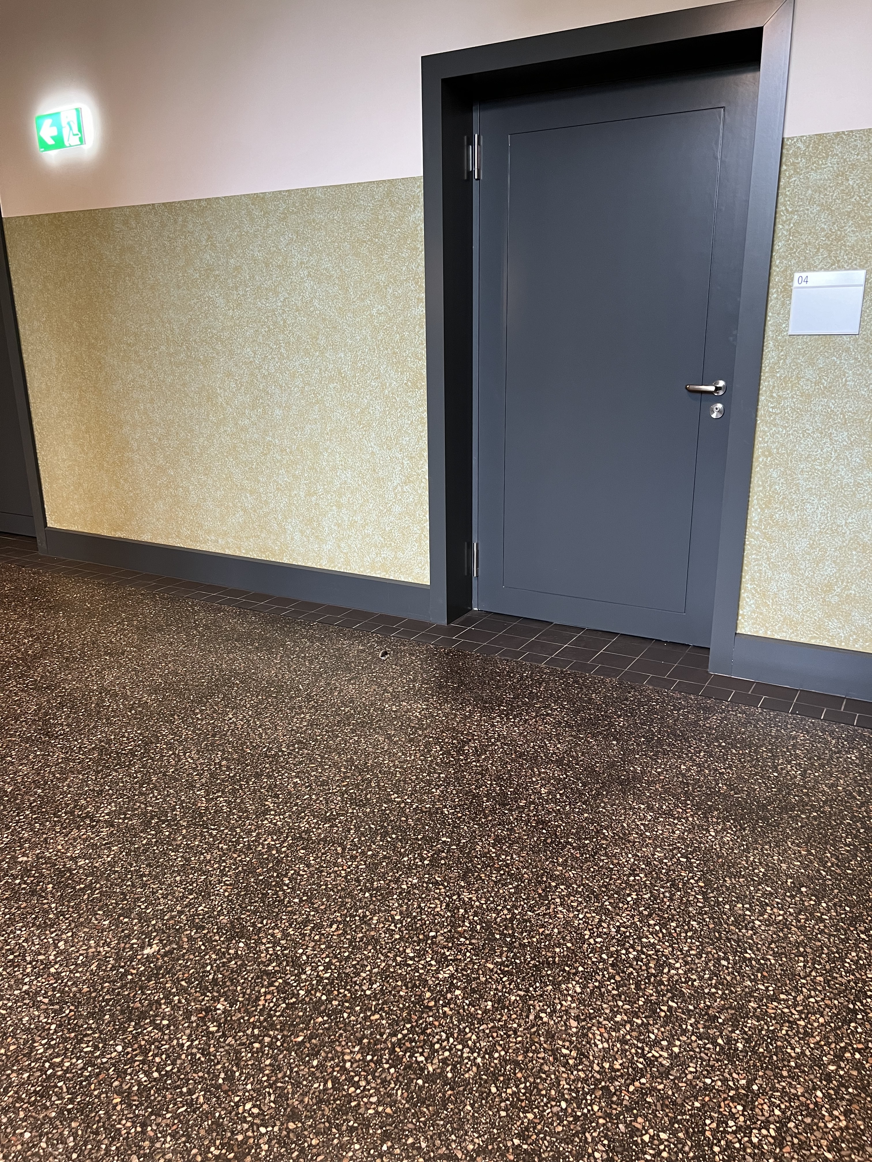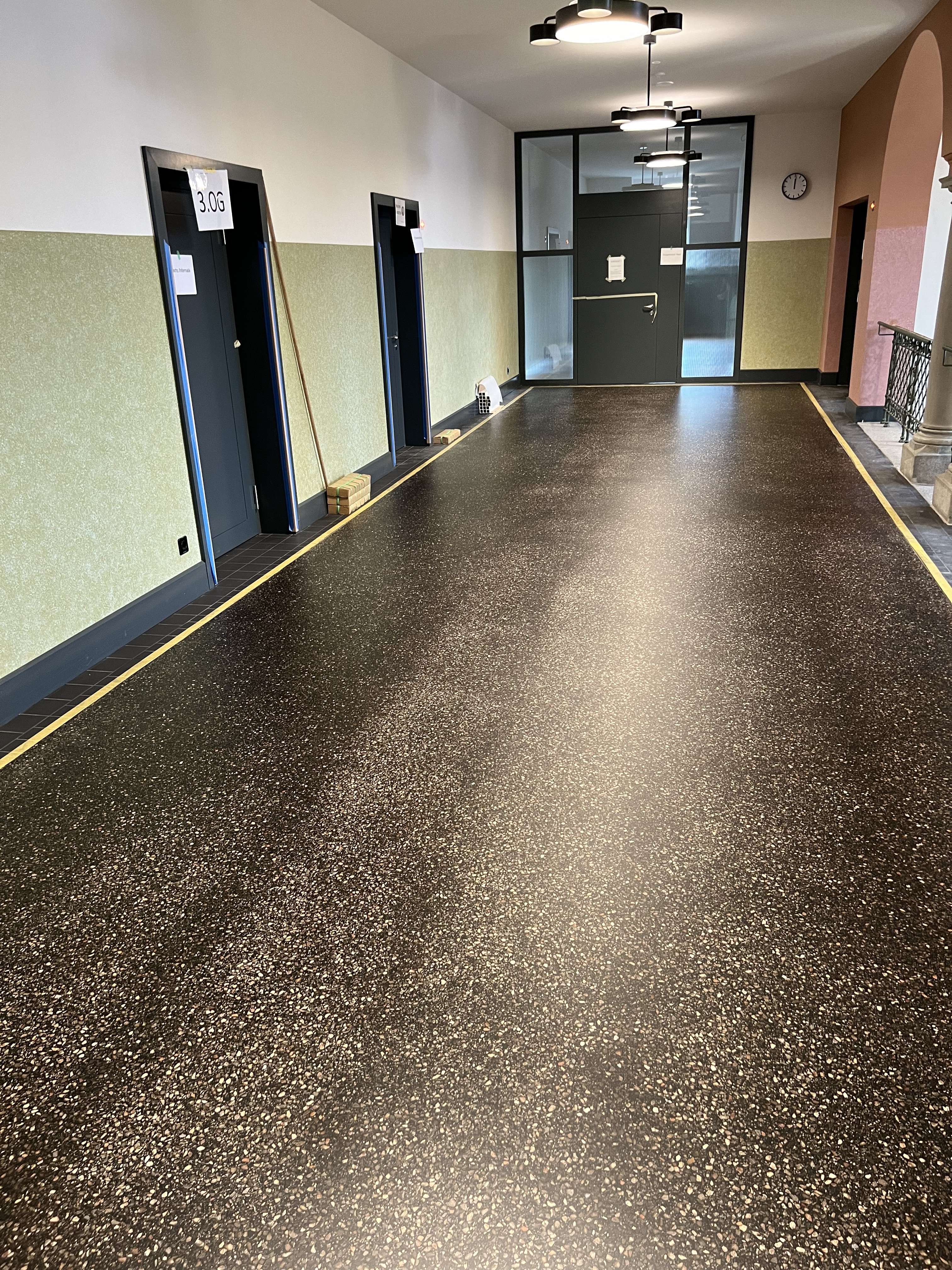 Ausgeführte Arbeiten 310m2 Innenboden, Einbau Schutz- und Deckschicht (DF 3) von Hand, geschliffen, PU-Fugen |