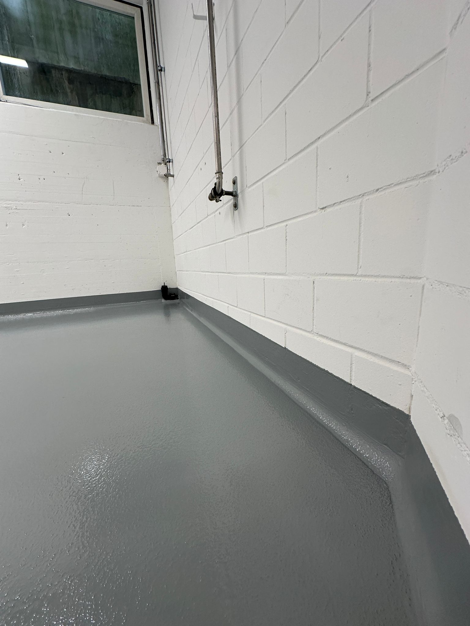| Ausgeführte Arbeiten 63m2 Untergrundvorbereitung mittels schleifen, Industriebodenbeschichtung mit System OS 8, Hohlkehle |