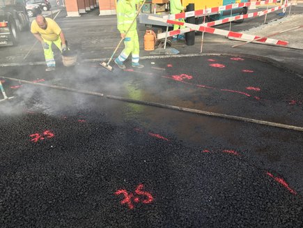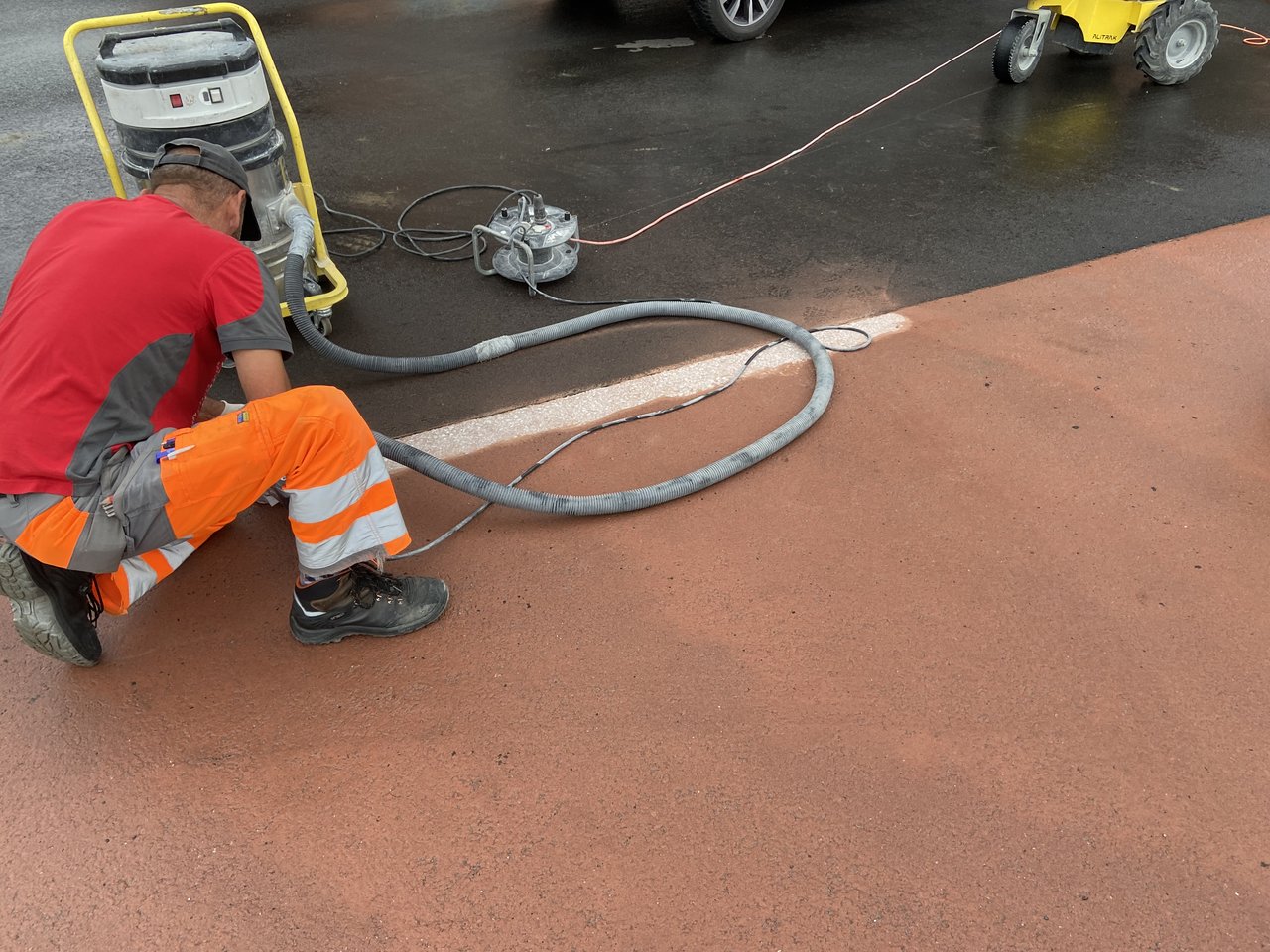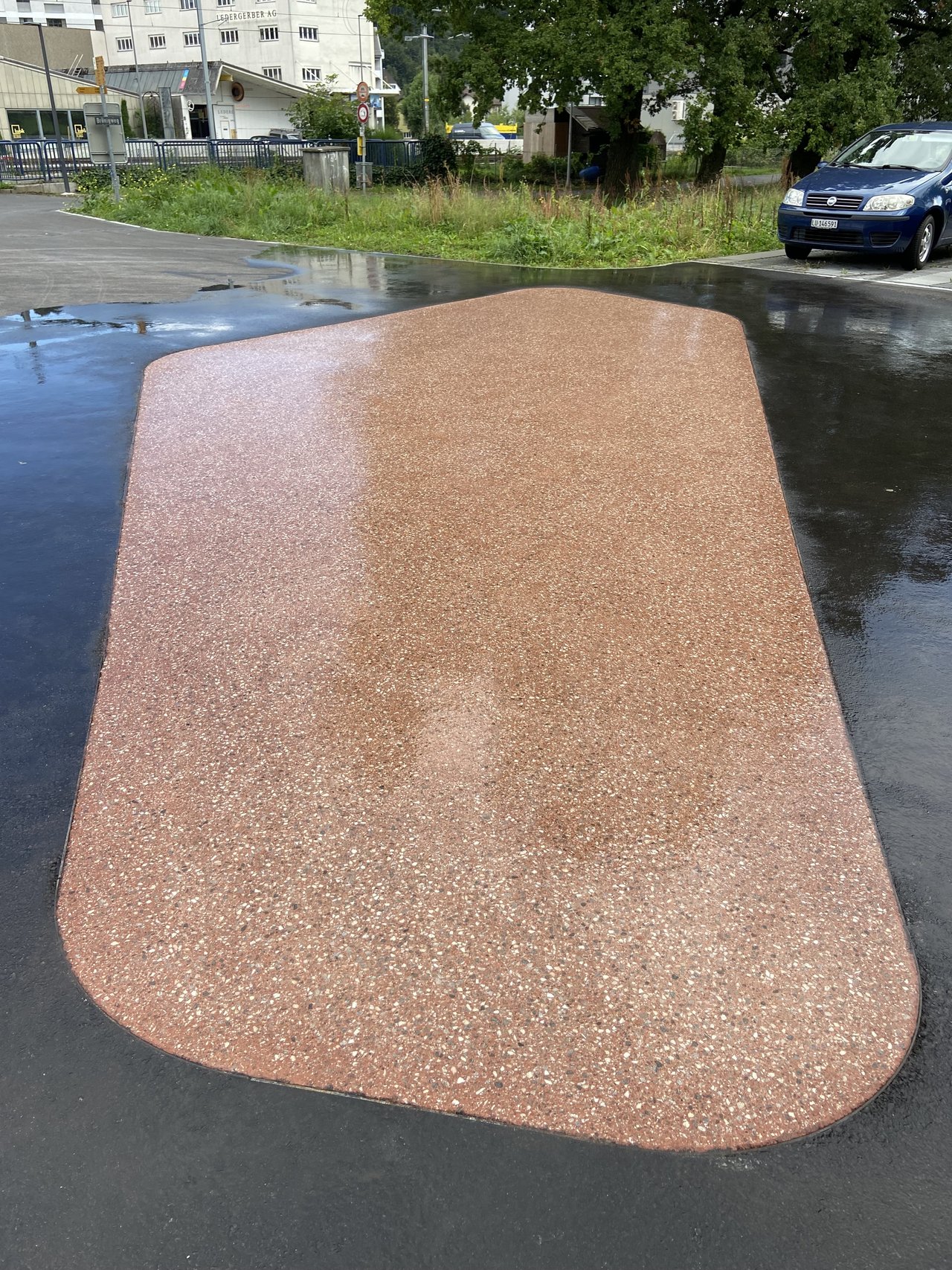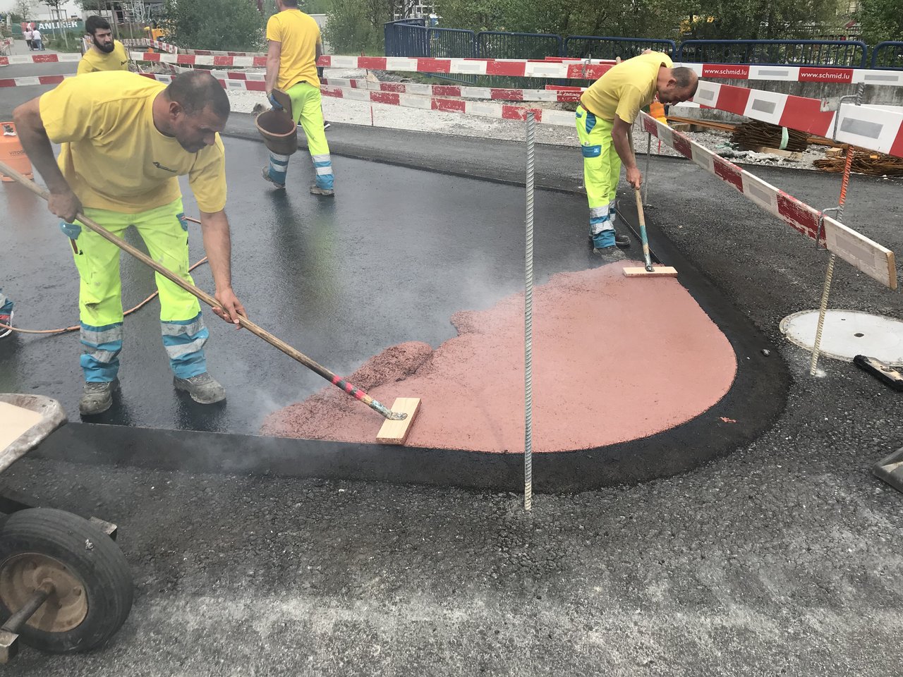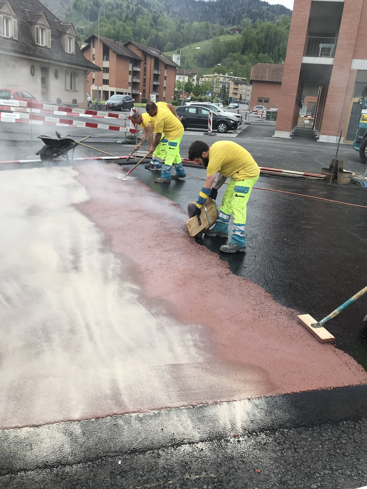 Die Bauseits vorbereitete Tragschicht aus PA-Belag diente uns als Untergrund. Nach einmessen des Gefällsbruchs, wurde die Fläche mit einer Schnur auf die Höhe kontrolliert und markiert. Im Anschluss konnten wir mit Gussasphalt das richtige Gefälle ausbilden und Unebenheiten ausgleichen. Als die Ausgleichsschicht abgekühlt war, begannen wir mit dem Einbau der Gussasphalt Schutzschicht „schwarz“. Nach Einbau der Schutzschicht fuhr der LKW in unser eigenes Belagswerk in Boningen und lud den ziegelroten Gussasphalt nach. Als der LKW wieder auf der Baustelle war, konnten wir mit der ziegelroten Deckschicht aus Gussasphalt beginnen.