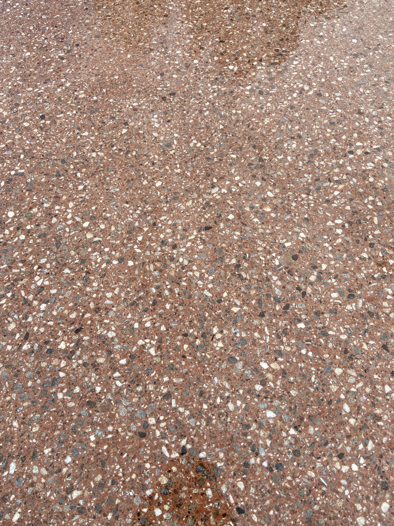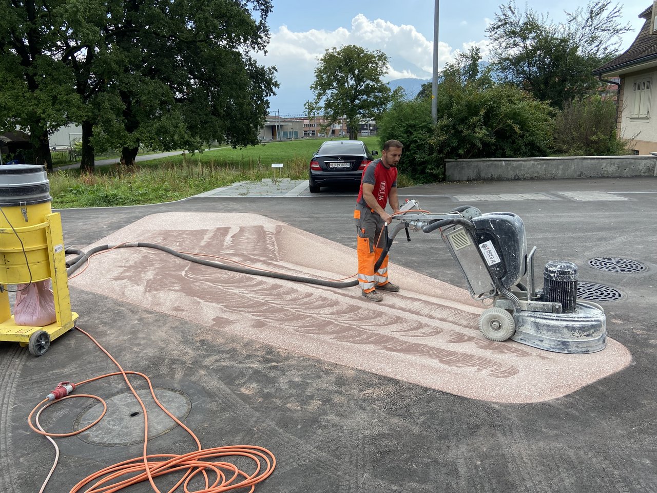Da die Fläche erst zu einem späteren Zeitpunkt geschliffen wurde, mussten wir die Oberfläche bezüglich Rutschfestigkeit mit Quarzsand einstreuen.