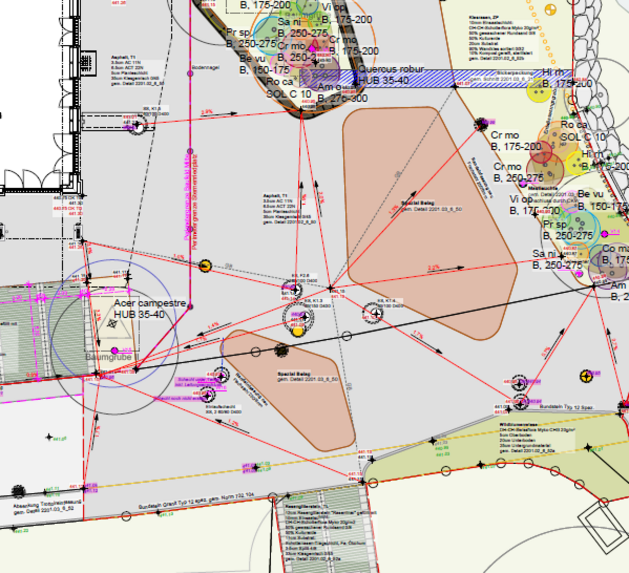 Die Umgebungsarbeiten wurden in verschiedenen Etappen ausgeführt. In der „Belagsetappe 2“ wurde die Firma Aeschlimann AG hinzugezogen und beauftragt, zur Platzgestaltung einen Ziegelroten Gussasphalt herzustellen und einzubauen. Nach Abschluss der Umgebungsarbeiten wurde der ziegelrote Gussasphalt noch fertig abgeschliffen.