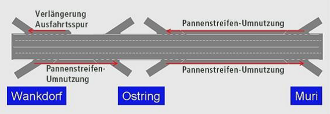 Der Autobahnabschnitt Bern-Wankdorf – Muri ist regelmässig überlastet. Bis der «Bypass Bern-Ost» in rund 20 bis 25 Jahren diesen Engpass beseitigen wird, soll der Verkehrsfluss mit einer Pannenstreifenumnutzung PUN erhöht werden. Mit PUN können die Fahrzeuge in den Spitzenzeiten den Pannenstreifen als Fahrstreifen nutzen.