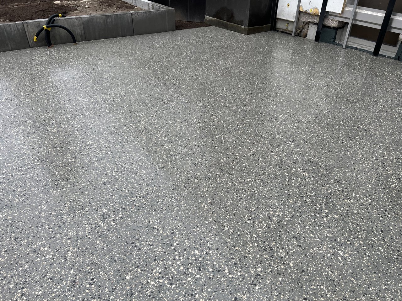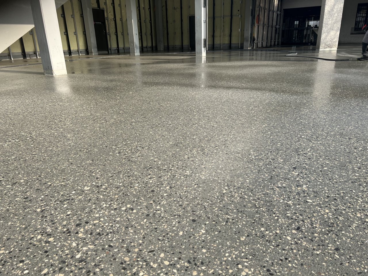 Durch das Schleifen und Stocken werden die edlen Zuschlagsstoffe freigelegt und kommen in ihrer ganzen leuchtenden Pracht zur Geltung. Die bearbeitete Oberfläche erfüllt die Rutschfestigkeitsklasse R13.