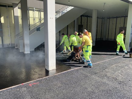 Als Nutzbelag hat sich die Bauherrschaft in Zusammenarbeit mit dem Architektenteam für einen farbigen, hellen Gussasphaltbelag mit speziellen eingemischten Zuschlagsstoffen entschieden.