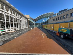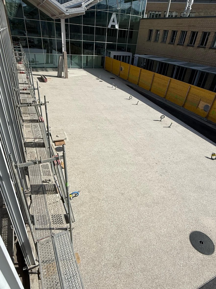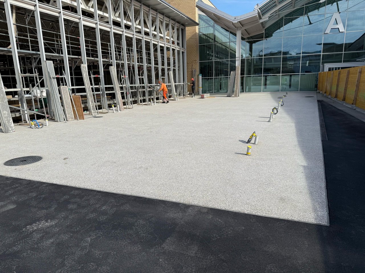 Die O. Aeschlimann AG wurde beauftragt, die Abdichtungs- und Gussasphaltarbeiten der neuen Konstruktionsbetondecke über der Schwimmhalle auszuführen sowie die damit verbundenen Walzbelagsergänzungen. Zur optischen Aufwertung des Eingangsbereiches fiel die Wahl des Nutzbelags auf eine von O. Aeschlimann AG eigens konzipierte Mischung. Diese Mischung enthält farbloses Bindemittel und weisses Hartgestein.
