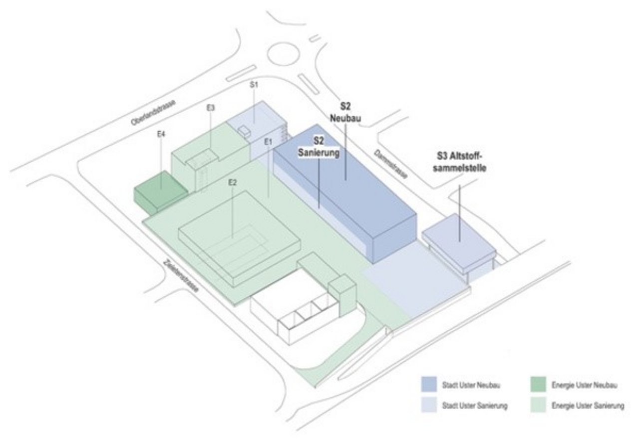 Die Projekte S1 «Oberlandstrasse 80, Sanierung Wohngebäude», S2 «Dammstrasse, Gesamtsanierung Werkliegenschaft» (Feuerwehrgebäude, neu: Stadthaus West), S3 «Neue Hauptsammelstelle» (Altstoffsammelstelle) und die E1 «Dammstrasse, statische Sanierung Erschliessungsplattform» sind die vier städtischen Teilprojekte der «Gesamtsanierung Werkhofareal Uster».